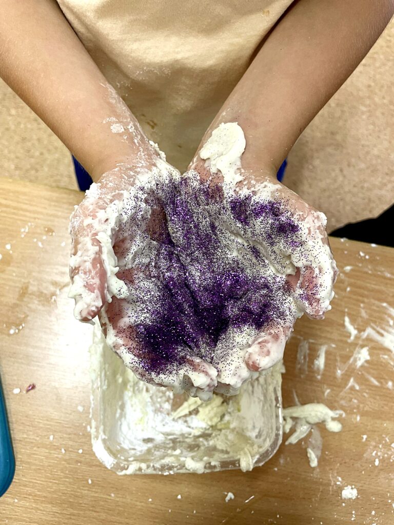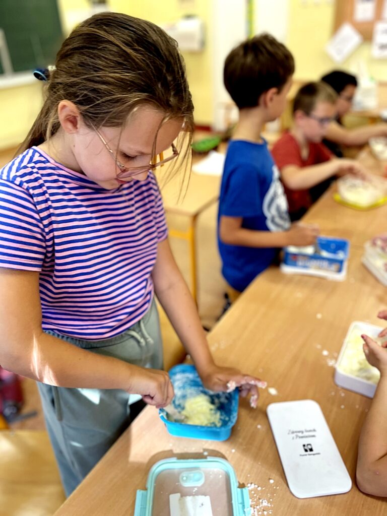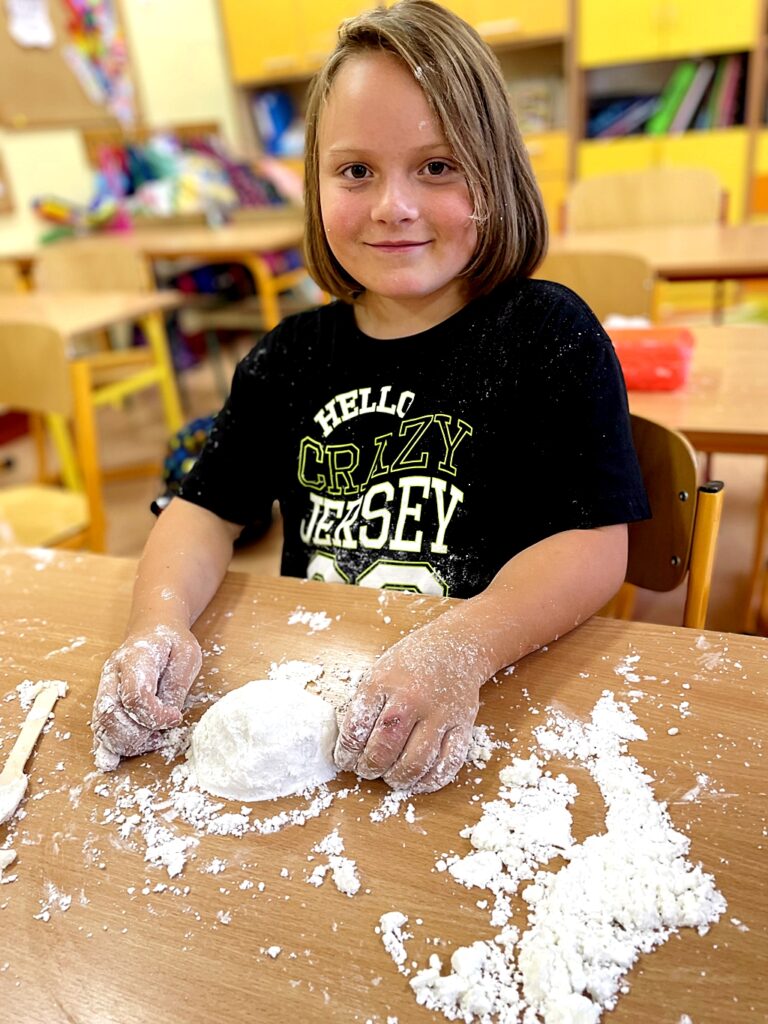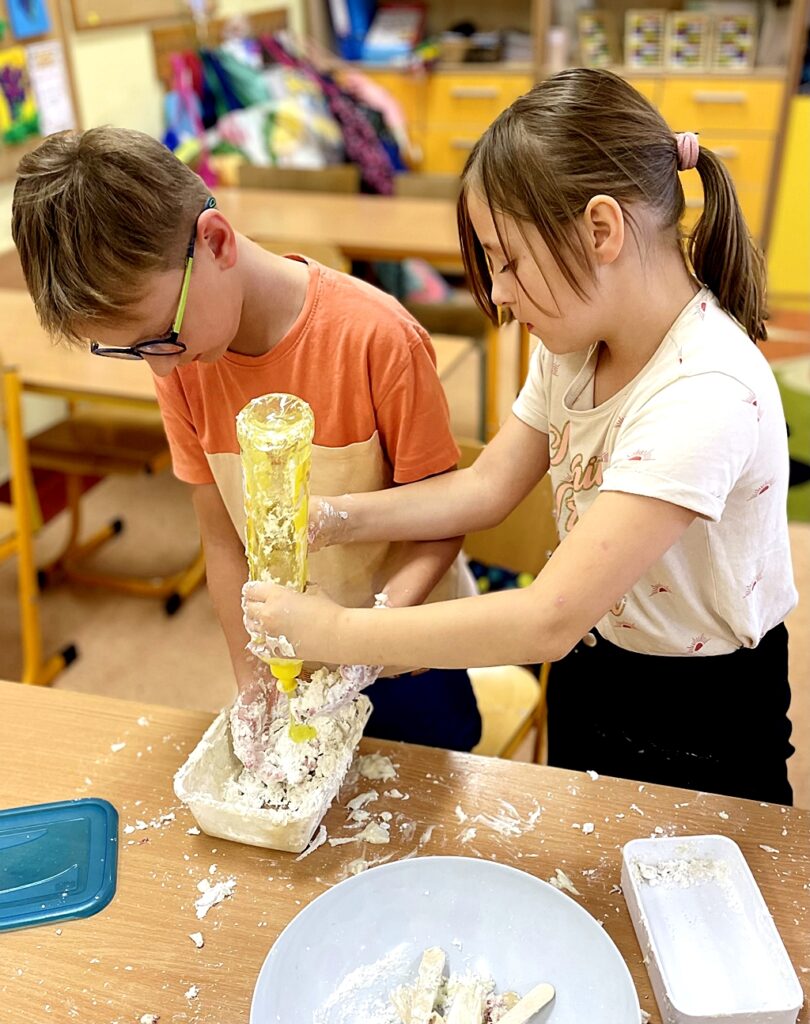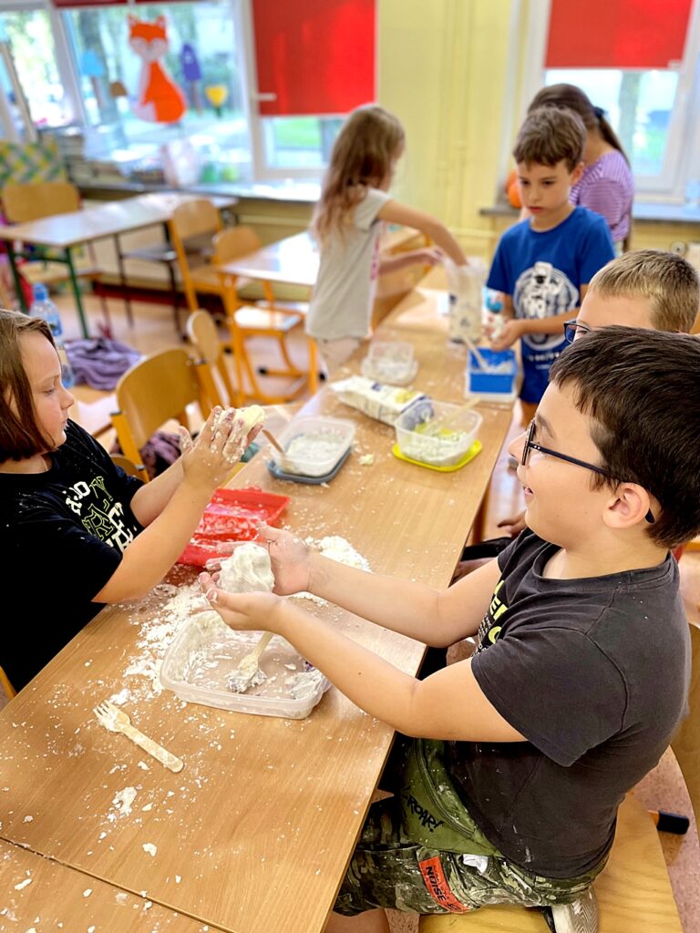 W zeszłym tygodniu, dzieci z  klasy II B, na zajęciach dodatkowych Zabawa zmysłami, samodzielnie wykonały masę sensoryczną. Bawiąc się, uczniowie stymulowali zmysł dotyku. System ten dostarcza informacji, które pozwalają m.in. na kształtowanie prawidłowego schematu i świadomości własnego ciała, orientacji w przestrzeni, planowania motorycznego, a nawet bezpieczeństwa emocjonalnego i umiejętności społecznych.